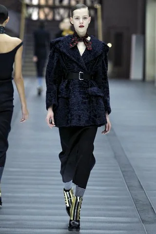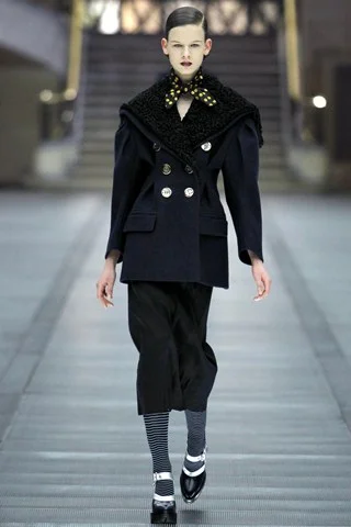 Ήταν μια κολεξιόν που τον κύριο λόγο είχαν τα παλτό. Βλέπουμε φορέματα με ζώνες, ανοίγματα που παίζουν αρμονικά με τα φερμουάρ ή μικρά ναυτικά στυλ με μεγάλα φαρδιά πέτα από περνούν πάνω από τον ώμο και φτάνουν στην πλάτη. Κάθε look συνοδευόταν από ένα φουλάρι, ξανά με ρίγες και πουά (ένας συνδυασμός που είδαμε συχνά), κάτι που πρόσθετε ξεγνοιασιά, ακριβώς αυτό που ζητά ένας πελάτης της Miu Miu. Τα ανέμελα τεζαρίσματα είχαν τεράστια ανταπόκριση, όπως είχαν και τα τεράστια κουμπιά στα σταυρωτά παλτό της κολεξιόν. Αξιοσημείωτα είναι και τα καλσόν, τόσο τα έντονα μονόχρωμα, όσο και τα ριγέ.