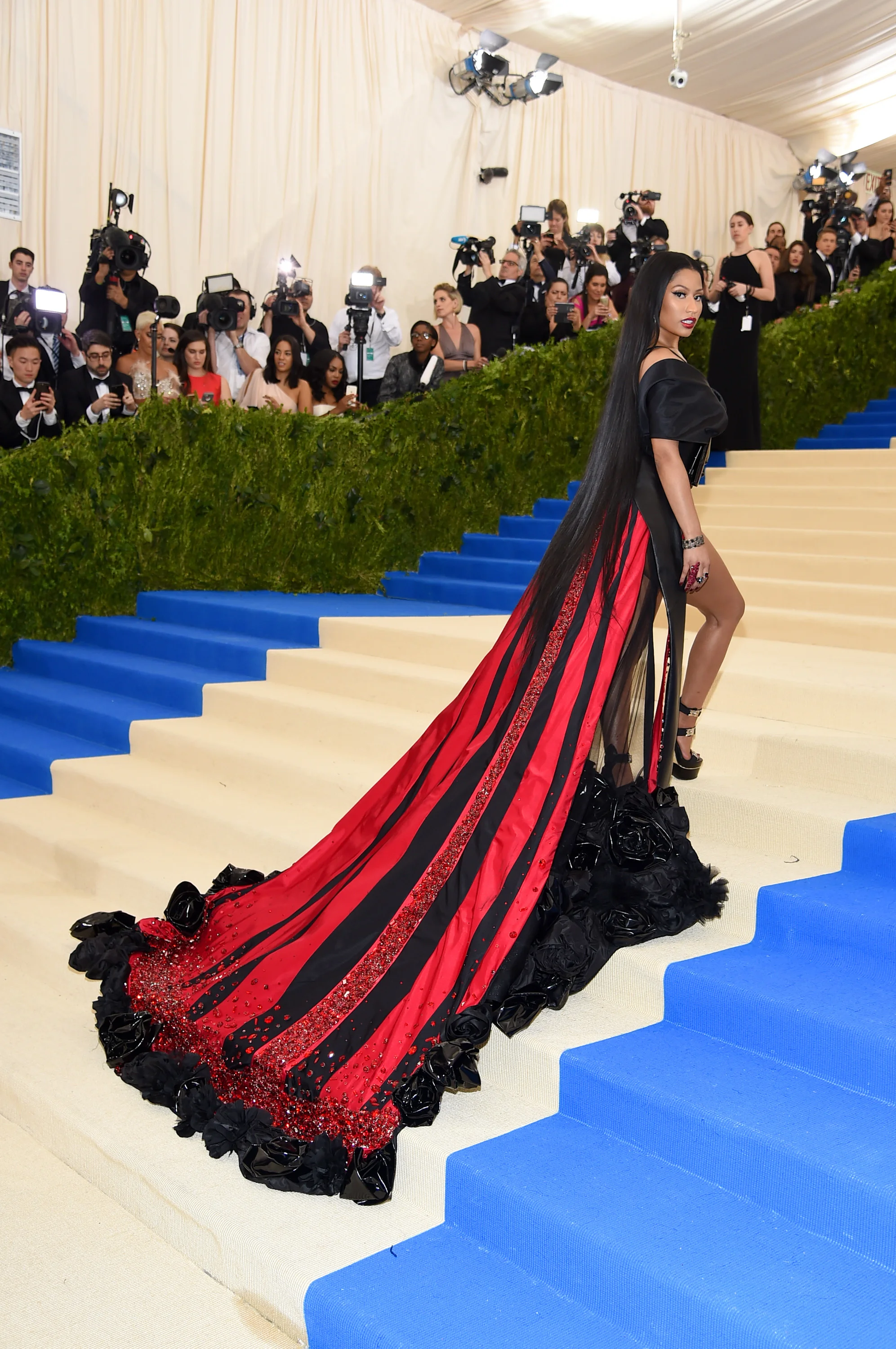 Η ράπερ και τραγουδίστρια Nicki Minaj φορούσε μια διάφανη τουαλέτα από οργαντίνα με μακριά ουρά, η οποία περιελάμβανε εκθαμβωτικό μεταξένιο ταφτά με ξεφτισμένες άκρες και μαύρα βινυλικά τριαντάφυλλα αιχμαλωτισμένα στο στρίφωμα και κάτω από την ουρά. Το φόρεμα συγκρατιόταν από ένα στράπλες σατέν ντουσέζ τοπ σε στυλ κιμονό, ενώ η δερμάτινη ζώνη του Obi περιελάμβανε μια μάσκα του προσώπου της Kawakubo. Η ουρά ήταν διακοσμημένη με μαύρες και κόκκινες λωρίδες σε μορφή ακτίνων, ενώ μια κόκκινη ακτίνα κρυστάλλων Swarovski έφτανε μέχρι το μπροστινό μέρος.