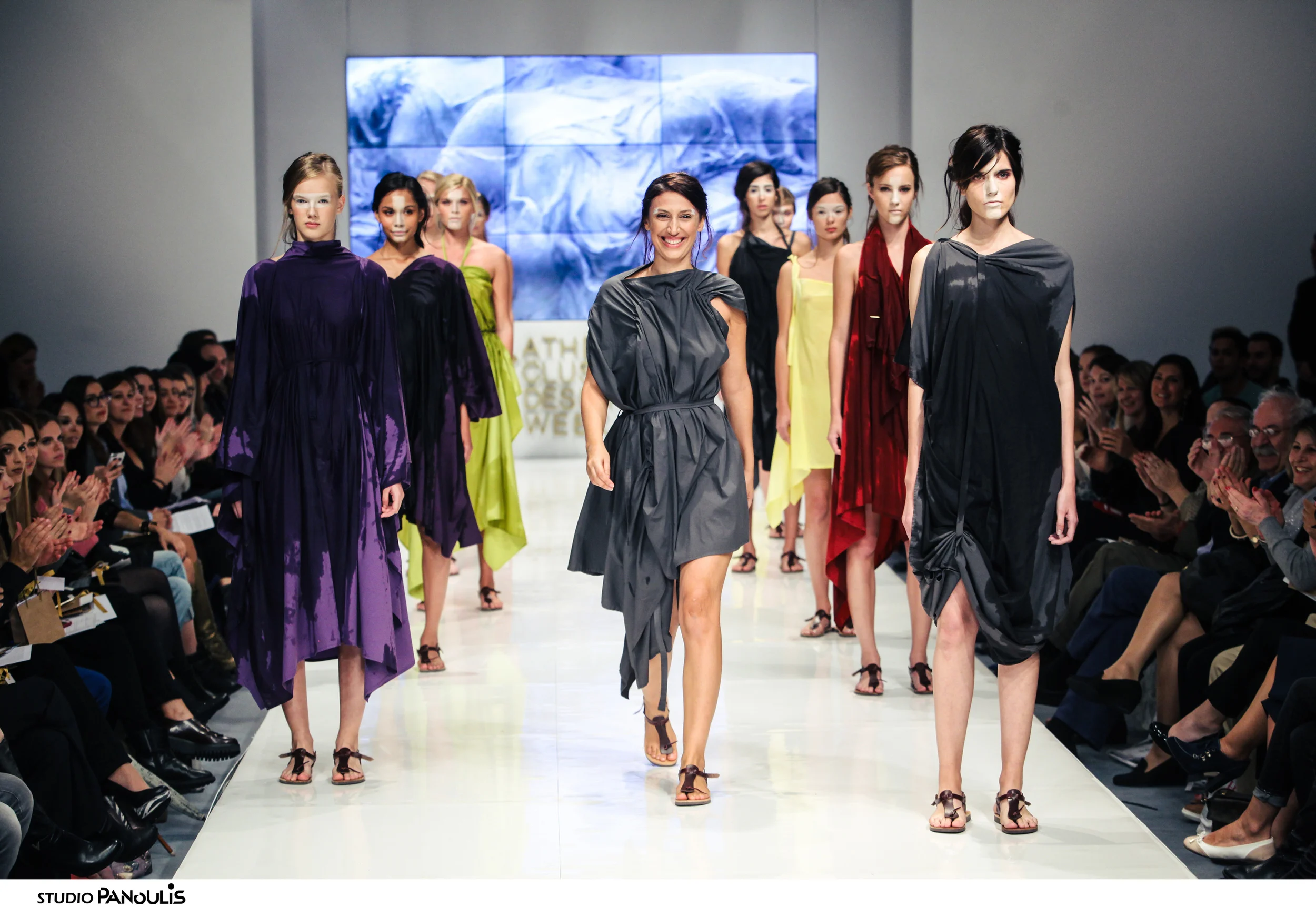 Η Κυπριακής καταγωγής σχεδιάστρια Eleni Kyriacou παρουσίασε την S/S 2016 συλλογή της με τίτλο “12 Greek Rectangles”. Εμπνευσμένη από την αρχαία ελληνική ενδυμασία και την χρήση του ορθογώνιου παραλληλόγραμμου σε αυτή παρουσίασε πολυμορφικές δημουργίες, σε μωβ, φωτεινό πράσινο και σκούρο κόκκινο χρώμα, οι οποίες μπορούν να μετατραπούν από φόρεμα σε πετσέτα θαλάσσης. Η Eleni Kyriacou, επηρεασμένη από το έργο των γλυπτών στην αρχαία Ελλάδα, οι οποίοι παρατηρούσαν τα μοντέλα με «υγρές πτυχώσεις», στο δεύτερο μέρος της επίδειξης παρουσίασε την συλλογή της με τον ίδιο τρόπο πετυχαίνοντας ένα αισθησιακό αποτέλεσμα.