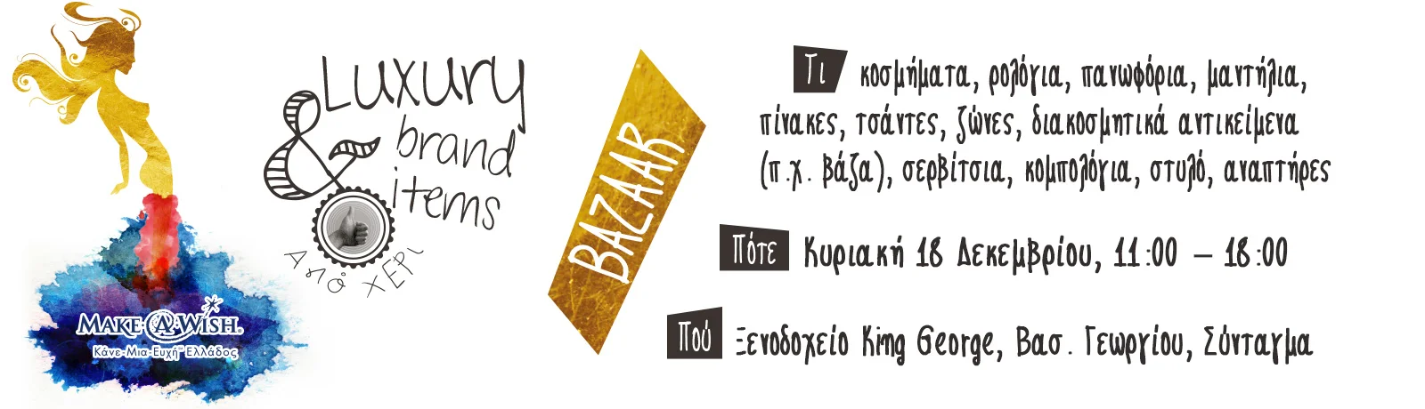 Ένα bazaar επώνυμων ειδών pre-owned θα πραγματοποιηθεί την Κυριακή 18 Δεκεμβρίου, από τις 11:00 έως τις 18:00, στο Ξενοδοχείο King George, για την ενίσχυση του έργου του Make-A-Wish (Κάνε-Μια-Ευχή Ελλάδος).