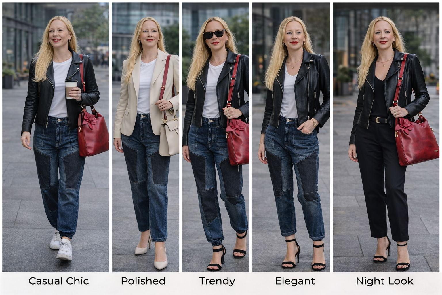 In this post, I transform one simple outfit into 5 different looks — from casual daytime to elegant evening styling.